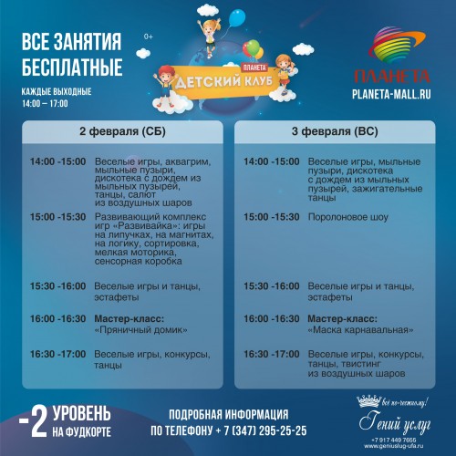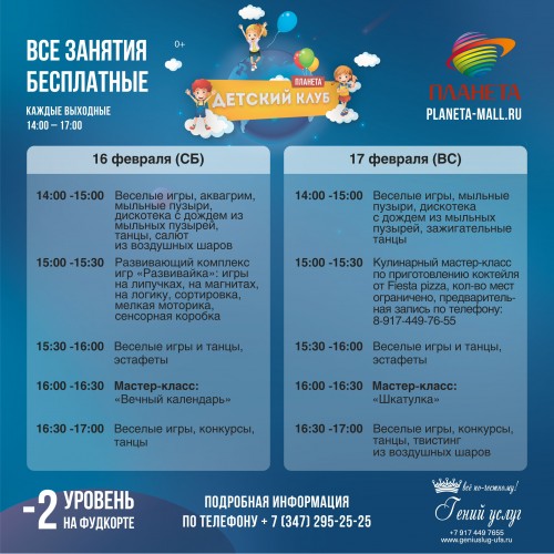 3 февраля с 15:00 до 15:30 пройдет веселое поролоновое шоу. А с 10 февраля по воскресеньям в это же время маленьких гостей детского клуба ТРЦ «Планета» будут ждать кулинарные мастер-классы по приготовлению пиццы и молочных коктейлей. Настоящий повар пошагово опишет весь процесс и поможет ребятам справиться со всеми трудностями. Неунывающие Барбоскины каждые выходные будут создавать праздничное настроение, танцевать, фотографироваться, веселиться и устраивать игры и конкурсы для мальчиков и девочек.