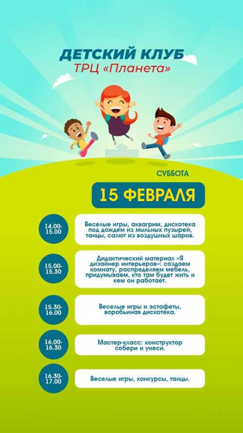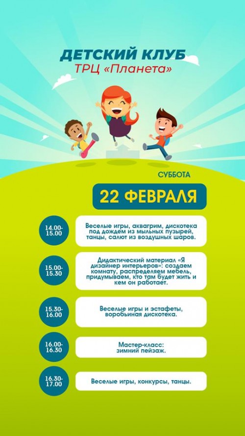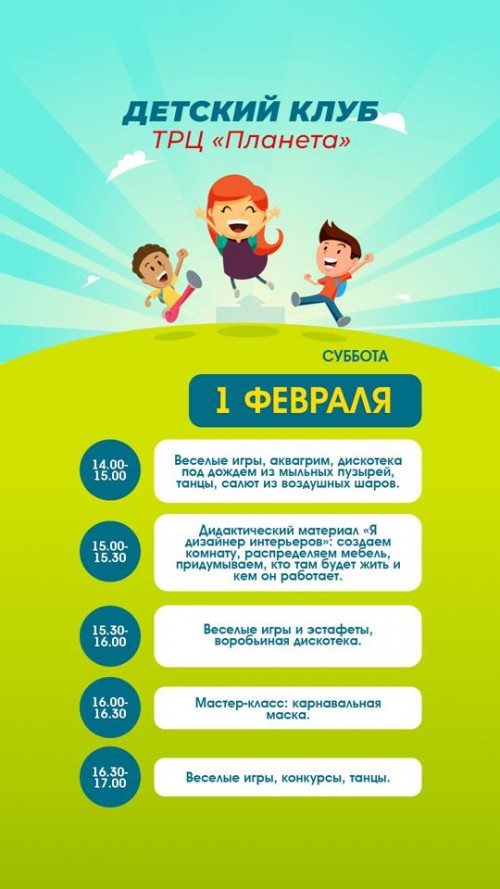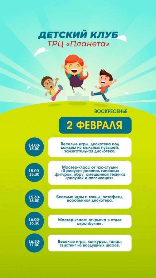 Каждые выходные февраля с 14:00 до 17:00 в детском клубе ТРЦ «Планета» малышей ждет насыщенная программа с творческими мастер-классами, веселыми играми, конкурсами и дискотеками. Ребята также смогут познакомиться с героями мультфильма «Щенячий патруль».