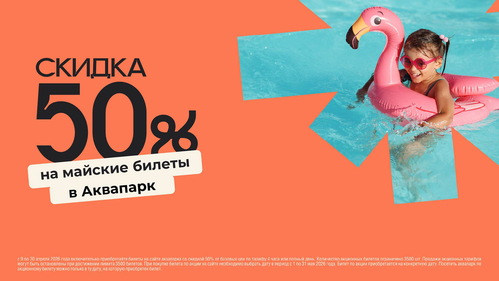 3. Предпродажа акционных билетов доступна для взрослого тарифа, тарифа юниор и детского тарифа 4 часа или полный день на будние или выходные дни мая 2026 года (с 01.05 по 31.05.2026 года включительно).